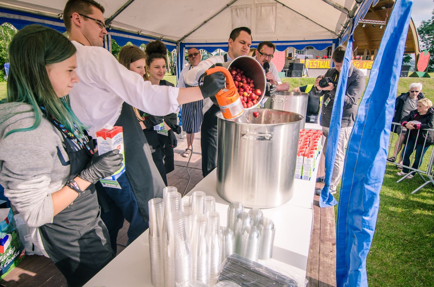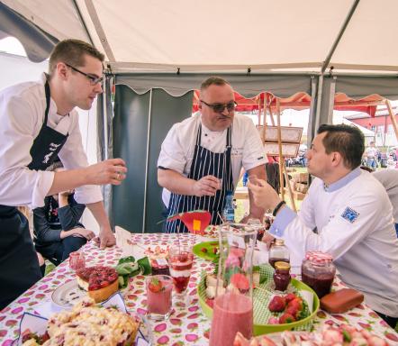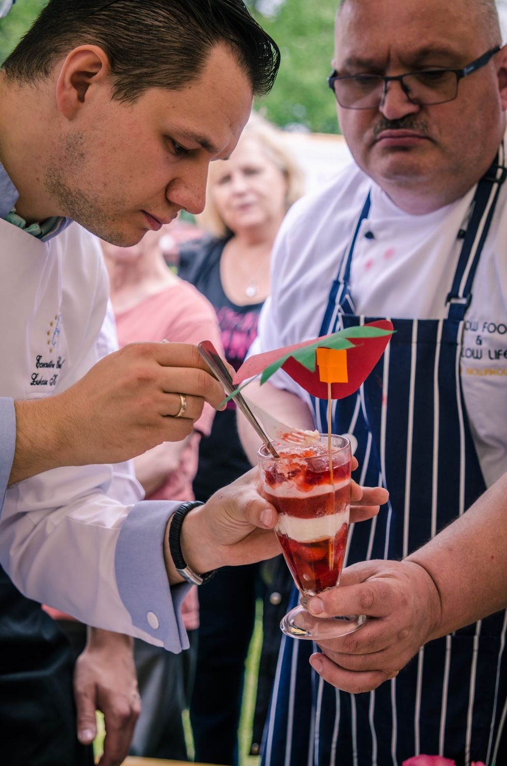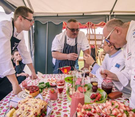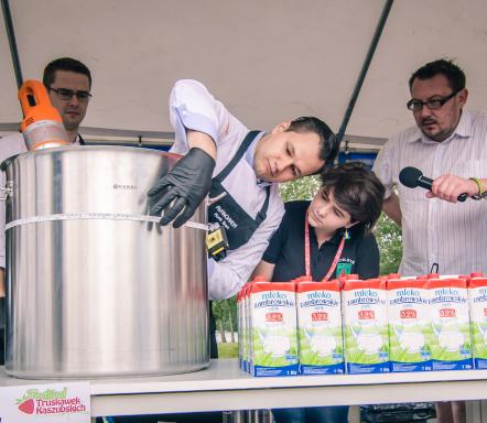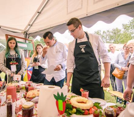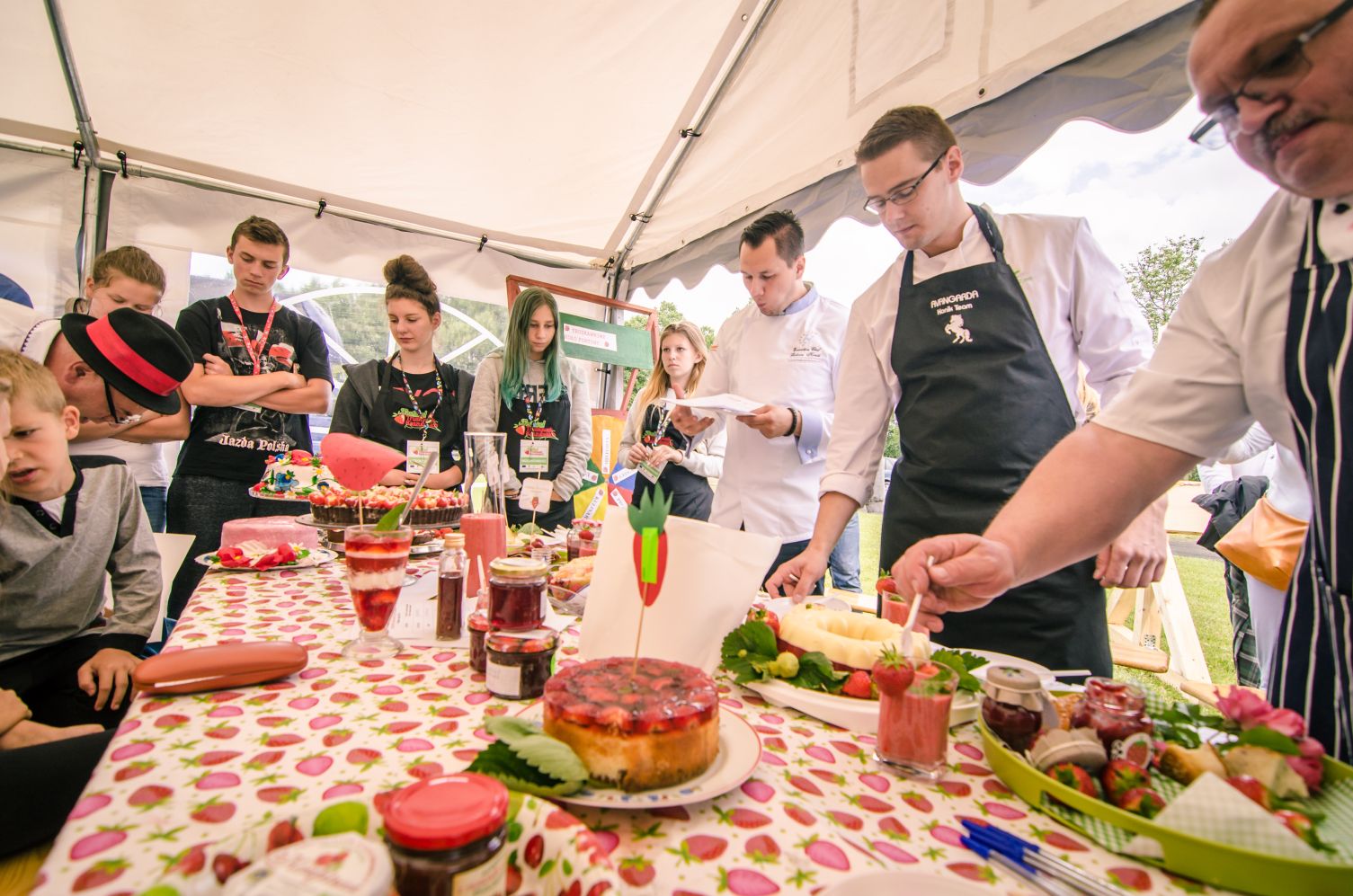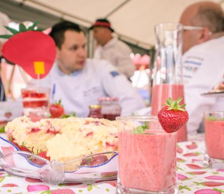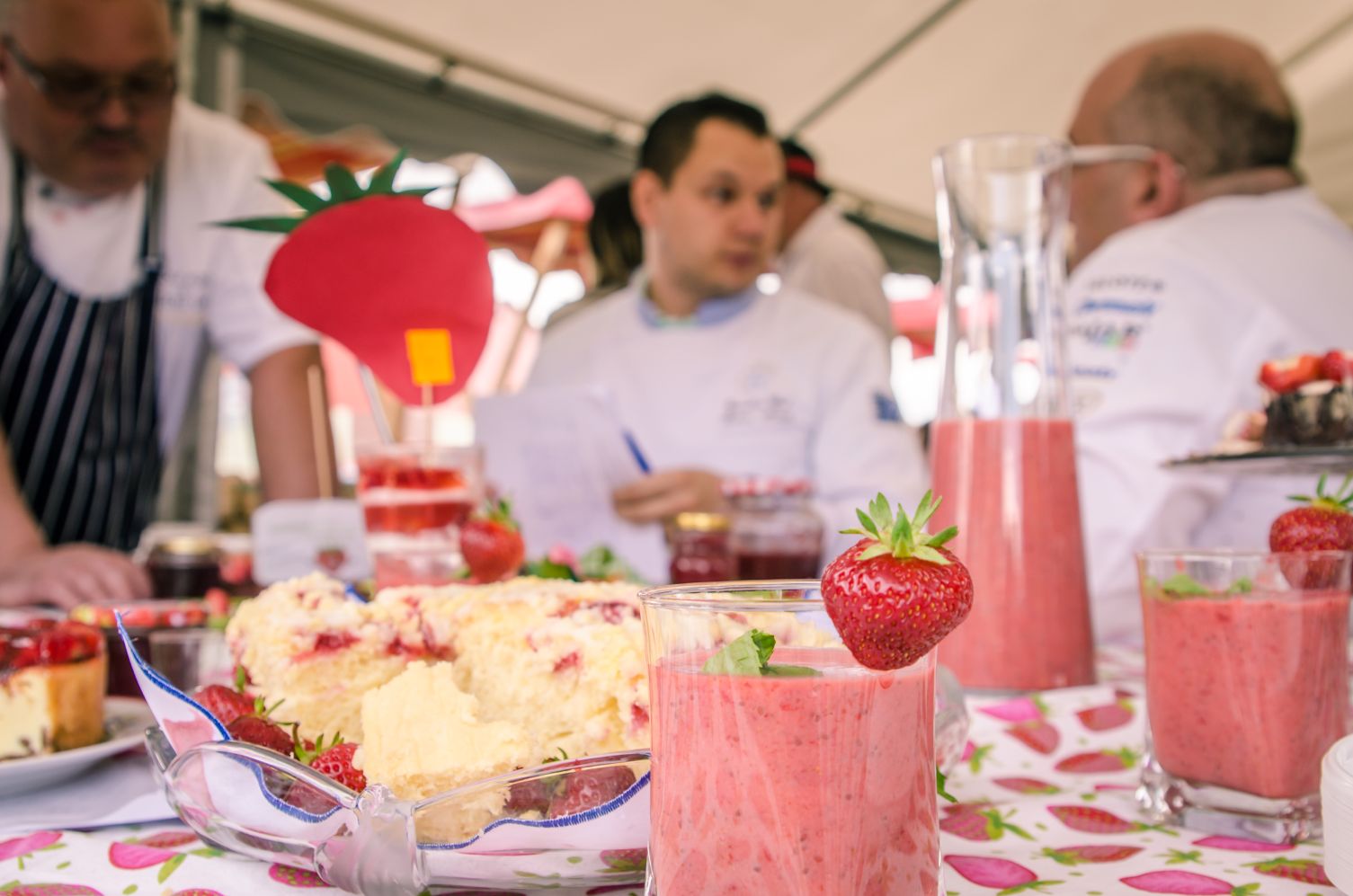 15.30 - Pokaz kulinarny w wykonaniu Stowarzyszenia Kucharzy Polskich - Krzysztof Szulborski i Andrzej Ławniczak ocena uczestników konkursu "Truskawka w roli głównej" - na najatrakcyjniejsze stoisko truskawkowe Festiwalu